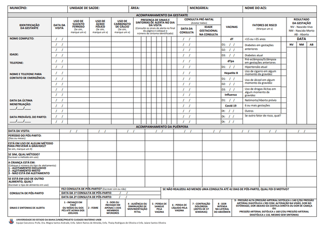A planilha é um instrumento a ser utilizado pelos ACS para o acompanhamento das mulheres desde a gestação até o sexto mês de pós-parto. A cada visita, o profissional adicionará novas informações ao impresso, o que permitirá acompanhamento da saúde de cada mulher durante todo o período gravídico puerperal.
